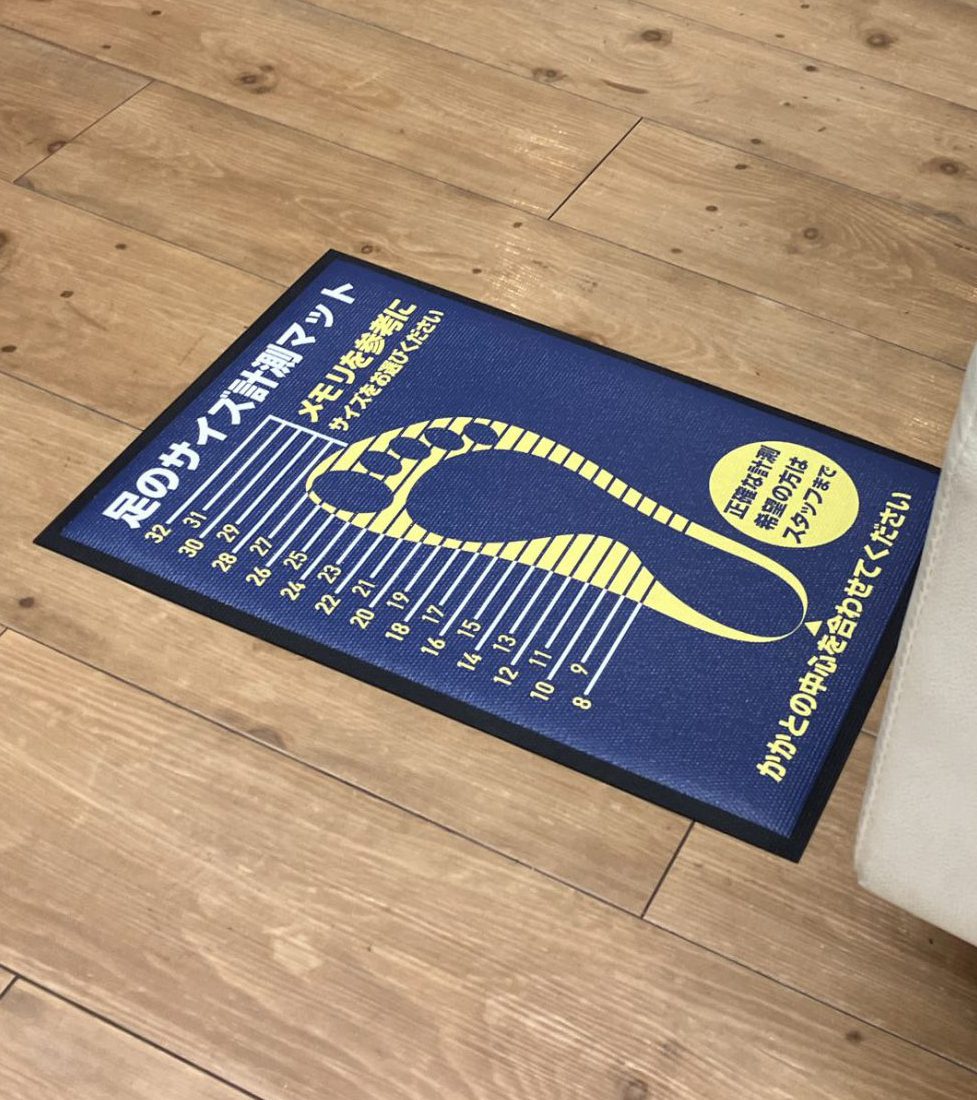 正しい靴選びをするためには、正しい足のサイズ把握することが大切です。足のサイズを計測するマットを売り場に置くことで、お客様にご自身の足のサイズに興味を持って頂きたいと考えました。また、スタッフがお客様にお声がけする際のきっかけになることも期待しました。