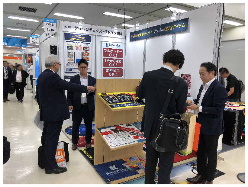 今回近々ご紹介予定の新商品、卓上で使える「オーダー・プレイマット」をご紹介。それ以外にもプリント・ケー ブルマットなど様々な仕様の商品を実際にご覧頂き、多くの方にプロモーション・マットの可能性を感じて頂け た展示会となりました。