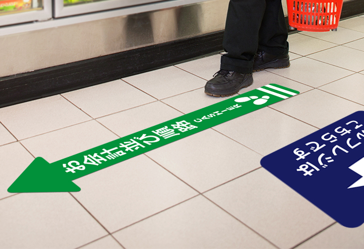 特徴 グロスコーティングのフロア専用シール。表面のコーティングは剝がれにくく破れにくい仕様、滑り止め加工で安全にお使い頂けます。ご使用後も糊残りの少ない再剥離粘着剤を採用、ふき取るだけでお手入れも簡単です。変形加工にも1枚から対応可能です。