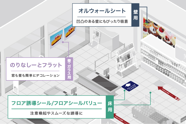 プロモーションや誘導サイン、壁のデコレーションまで、アイデア次第で幅広くご活用いただけます。